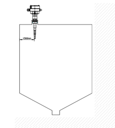 垂直安裝時,為了避免圓柱容器中介質堆角和容器壁自身電抗造成的測量誤差,建議安裝在距離容器壁大于500mm處(見圖)。