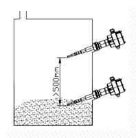 當由于測量需要,料倉內要求安裝多臺儀表時,應保證儀表之間的安裝間距大于500mm,防止儀表之間的探頭相互干擾,導致測量不可靠(見圖)。